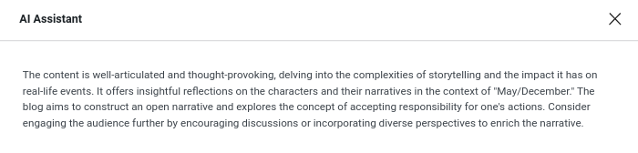 And that’s where the audience is pulled in, because it’s our duty to interpret the experiences in our own lives as well as the stories we witness. We know what Gracie’s narrative was. What was Elizabeth’s? Offering to tell Gracie’s story through a lens of empathy; seducing Gracie into consenting to Elizabeth’s sleazy movie. Thus Gracie is mirrored accurately in the end; her “true love” narrative exposed for its ruthless self-interest.